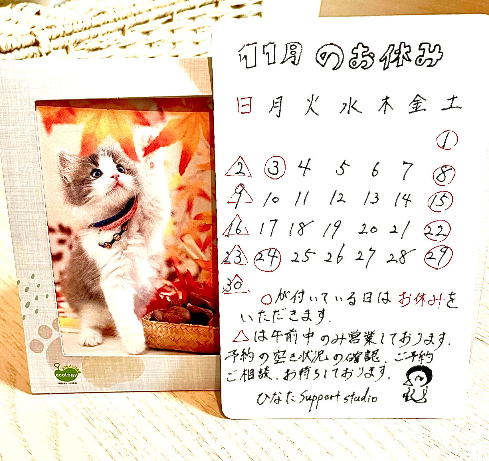 お世話になっております、ひなたSupport studioです、11月の予定が出ました